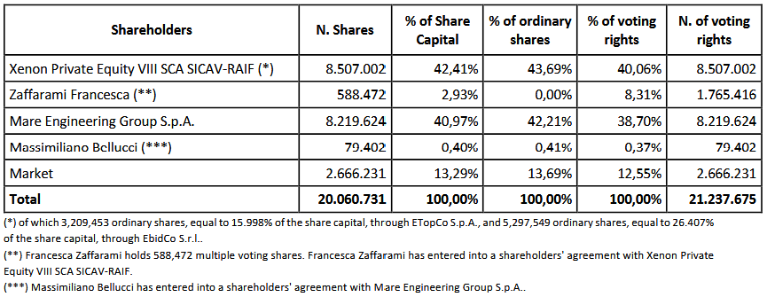 The subscribed and paid-up share capital is equal to Euro 8.451.865,50 divided into no. 20.060.731 shares admitted to trading on Euronext Growth Milan, with no indication of par value, of which no. 19.472.259 ordinary shares (ISIN IT0005373417) and no. 588.472 multiple voting shares (IT0005377467.00).