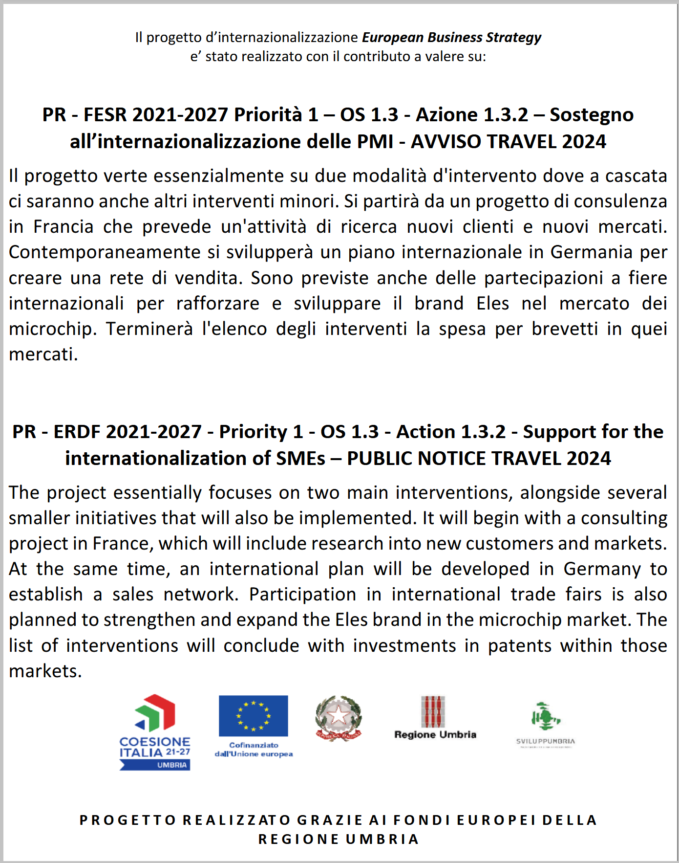il progetto verte essenzialmente su due modalità d'intervento dove a cascata ci saranno anche altri interventi minori. Si partirà da un progetto di consulenza in Francia che prevede un'attività di ricerca nuovi clienti e nuovi mercati. Contemporaneamente si svilupperà un piano internazionale in Germania per creare una rete di vendita. Sono previste anche delle partecipazioni a fiere internazionali per rafforzare e sviluppare il brand Eles nel mercato dei microchip. Terminerà l'elenco degli interventi la spesa per brevetti in quei mercati